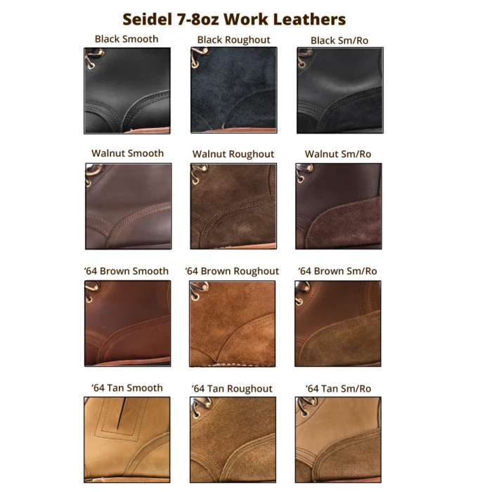 | Lower Leather | MaxSupport Black Smooth 7-8oz:, MaxSupport Black Roughout 7-8oz, MaxSupport Walnut Smooth 7-8oz, MaxSupport Walnut Roughout 7-8oz, 1964 Black Roughout 7-8oz, 1964 Black Smooth 7-8oz, 1964 Brown Smooth 7-8oz, 1964 Brown Roughout 7-8oz, 1964 Tan Smooth 7-8oz, 1964 Tan Roughout 7-8oz, WeatherShield Brown Smooth 7-8oz, WeatherShield Black Smooth 7-8oz |