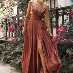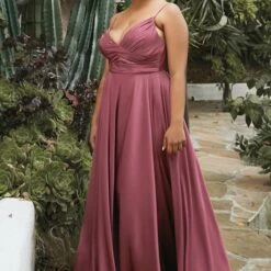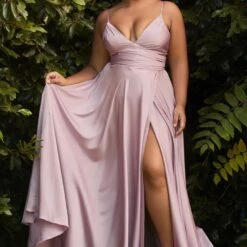 LaDivine by Cinderella Divine 7485C A-line plus size bridesmaid dress features a ruched surplice bodice with a V-neckline, spaghetti straps and a low-rise back. This soft satin formal gown finishes in a crossover skirt with a sky-high slit and a brush train.