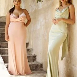 LaDivine by Cinderella Divine 7487 slim satin bridesmaid dress features a low cowl neckline, adjustable spaghetti straps and an open back with self-tie sash.