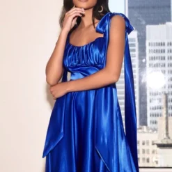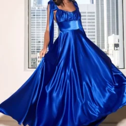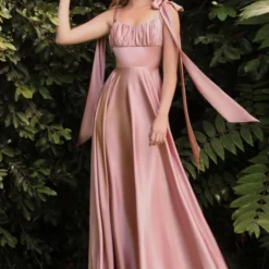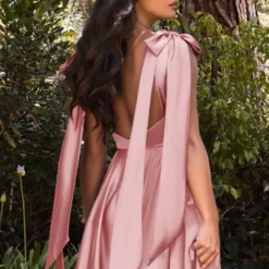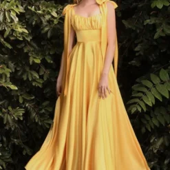 LaDivine by Cinderella Divine 7490 A-line satin prom dress features a ruched sweetheart bust over a contour waistband, jazzed up with self-tying bow straps. This backless formal gown finishes in a gorgeously flared skirt.