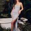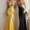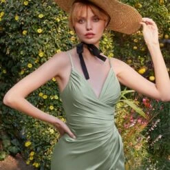 LaDivine by Cinderella Divine 7494 slim satin formal dress features a faux wrap silhouette with a V-neckline, adjustable spaghetti straps and a low-rise back. Gorgeous ruching lends texture to this special occasion gown, finished with a thigh-high slit and a brush train.