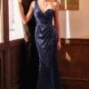 LaDivine by Cinderella Divine C140 fitted prom dress is fashioned in sequin velvet, with an asymmetrical one-shoulder neckline and a low zipped-up back. A cutaway side slit accents this sparkly designer gown, finished with a sweep train.