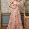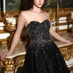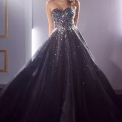 LaDivine by Cinderella Divine CB114 prom ballgown is encrusted with multicolor rhinestones, with a strapless sweetheart neckline and a low zipped-up back. This tulle formal dress finishes in a voluminous skirt and a semi-chapel train.