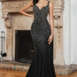 LaDivine by Cinderella Divine CB119 stretch satin prom dress is encrusted in heat-set stones, with a sweetheart neckline, slim straps, and an open back. This sparkly backless gown is completed with a horsehair hem and sweep train.