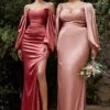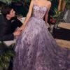 LaDivine by Cinderella Divine CC2164 floral glitter prom dress features a sheer corset bodice with a plunging off-the-shoulder neckline and draped sleeves. Three-dimensional appliques luxuriously embellish this slim designer gown, finished with a thigh-high slit, scalloped hem, and court train.