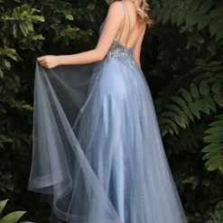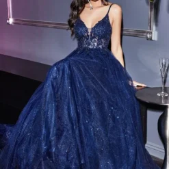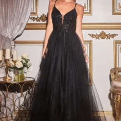 LaDivine by Cinderella Divine CD0154 prom ballgown features a sheer sequin lace bodice with a plunging neckline and double straps that form a strappy open back. This designer formal dress finishes in a voluminous skirt crafted in tulle over glitter net, and finished with a horsehair hem and a sweep train.