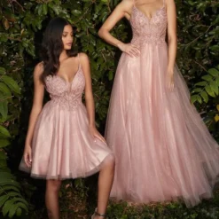 LaDivine by Cinderella Divine CD0195 formal dress features a beaded embroidered sheer top with accent on the plunging neckline, spaghetti straps and open V-back. The gorgeously flared skirt is crafted in tulle over glitter net and satin, completing this sleeveless A-line gown.
