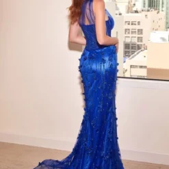 LaDivine by Cinderella Divine CD0203 sequin tulle prom gown features a sheer corset bodice with an off-the-shoulder sweetheart neckline and fringe sleeves. A thigh-high slit accents this column-style formal dress, finished with a mid-rise back, horsehair hem, and sweep train.