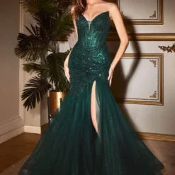 LaDivine by Cinderella Divine CD0214 long party dress features linear beadwork from the sheer top to the drop waist, crowned with a strapless plunging neckline. The voluminous skirt is crafted in tulle over glitter net, detailed with a thigh-high slit, horsehair hem, and court train. This trumpet-style formal gown is completed with a low illusion back.