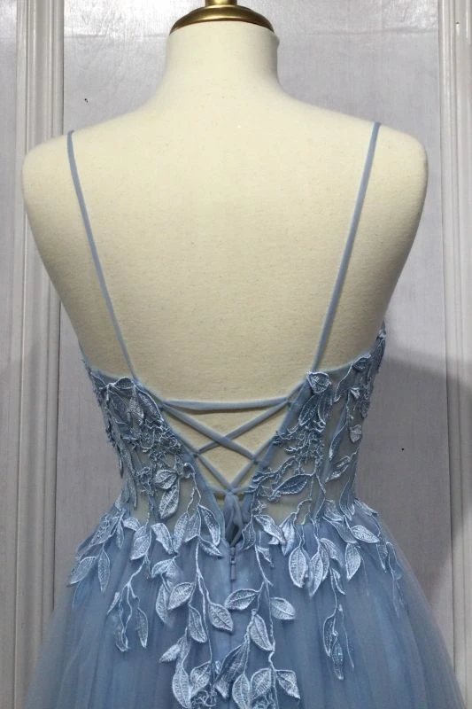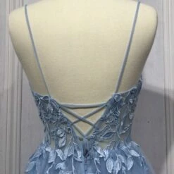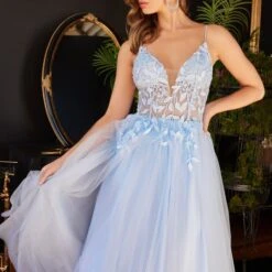LaDivine by Cinderella Divine CD2214 A-line prom dress features an illusion bodice in floral embroidery, with a plunging V-neckline and spaghetti straps. The gathered tulle skirt and the low laced-up back add flair to this designer formal gown, finished with a sweep train.
