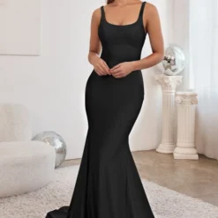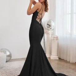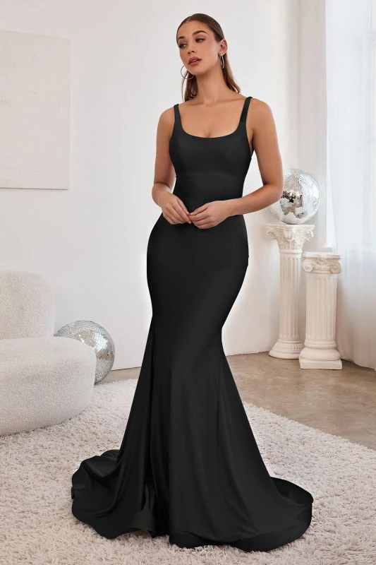 LaDivine by Cinderella Divine CD2219 fit and flare formal dress is crafted in stretch satin, with a scoop neckline, slim straps, and an open laced-up back. The empire waist and ruched derriere add style to this trendy prom gown, finished with side and back godets that spill to a horsehair hem and court train.