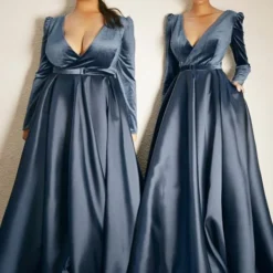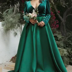 LaDivine by Cinderella Divine CD226C A-line plus size formal dress features a surplice velvet bodice with a plunging V-neckline and puff long sleeves. A slim buckle belt tops the pleated mikado skirt, finished with side pockets and a sweep train.