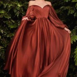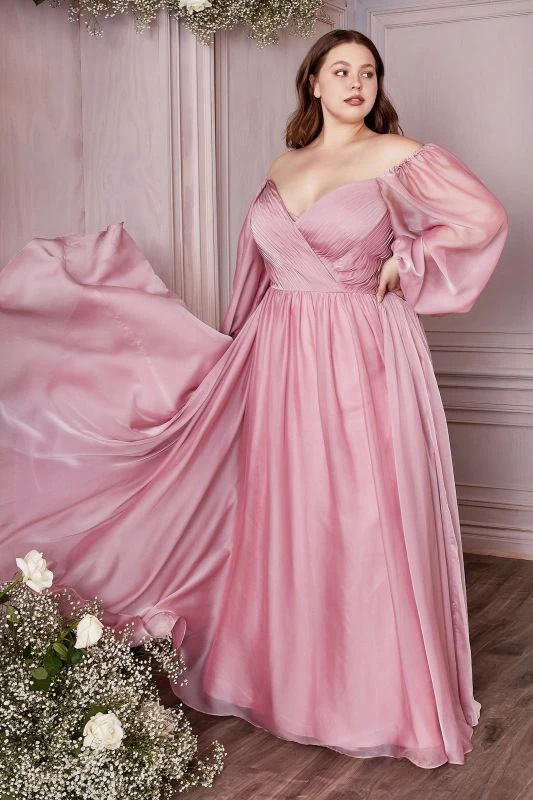 LaDivine by Cinderella Divine CD243C plus size prom gown features a ruched surplice bodice with an off-the-shoulder sweetheart neckline and sheer bishop sleeves. This A-line chiffon dress is completed with a zipped-up mid-rise back and a fully gathered skirt.