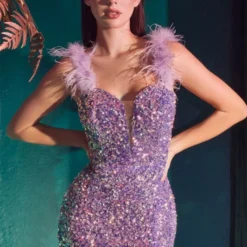 LaDivine by Cinderella Divine CD248 Feather Straps Sequin Formal Dress