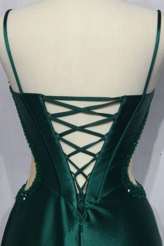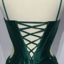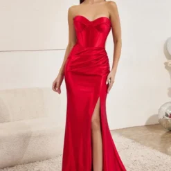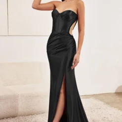 LaDivine by Cinderella Divine CD273 slim-fit formal gown features a corset top with a strapless sweetheart neckline and illusion side cutouts with tonal beads. The draped topskirt adds texture to this satin prom dress, finished with a thigh-high slit, lace-up back, and sweep train.