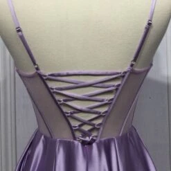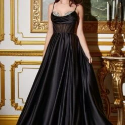 LaDivine by Cinderella Divine CD276 satin A-line formal dress features a sheer corset bodice with a cowl drape that accentuates the beaded sweetheart neckline. The pleated skirt with a sky-high slit adds a sultry touch to this designer prom gown, finished with adjustable spaghetti straps, a laced-up illusion back, and a sweep train.