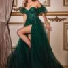 LaDivine by Cinderella Divine CD287 long party dress features a ruched surplice bodice with a strappy one-shoulder neckline that complements the exposed back. A shark-bite slit accents this sparkly fitted gown, finished with a brush train.