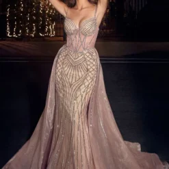 LaDivine by Cinderella Divine CD863 long party dress in geometric beaded tulle features a sheer corset bodice with a sweetheart neckline and spaghetti straps. The voluminous glitter tulle overskirt with a horsehair hem and semi-chapel train adds drama to this fitted prom gown, offset with a low illusion back.