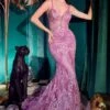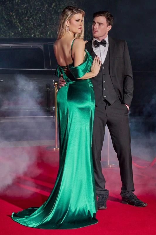 LaDivine by Cinderella Divine CD875 soft satin prom dress features a rhinestone-beaded sweetheart neckline, spaghetti straps and a low laced-up back. The pleated surplice bodice has draped off-the-shoulder sleeves that add drama to this column-style formal gown, finished with a high cutaway slit and a sweep train.