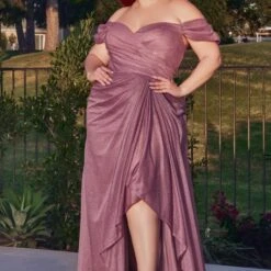 LaDivine by Cinderella Divine CD878C plus size prom gown features a ruched surplice bodice with an off-the-shoulder sweetheart neckline and draped sleeves. The gathered skirt with a thigh-high slit and sheer sash adds style to this slim-flare glitter dress, finished with a mid-rise back, ruched derriere, and sweep train.