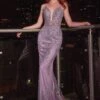 LaDivine by Cinderella Divine CD885 prom dress features a slim silhouette in sequin velvet, with a puff long sleeve edging the one-shoulder neckline. The front keyhole complements the thigh-high slit on this designer formal gown, finished with a zipped-up back and a court train.