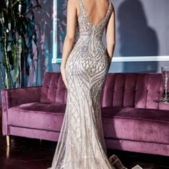 LaDivine by Cinderella Divine CD935 long party dress is styled in geometric beaded mesh over lace and satin, with a plunging V-neckline and illusion V-back. The beaded waist adds definition to this fitted sleeveless gown, finished with a horsehair hem and sweep train.