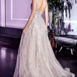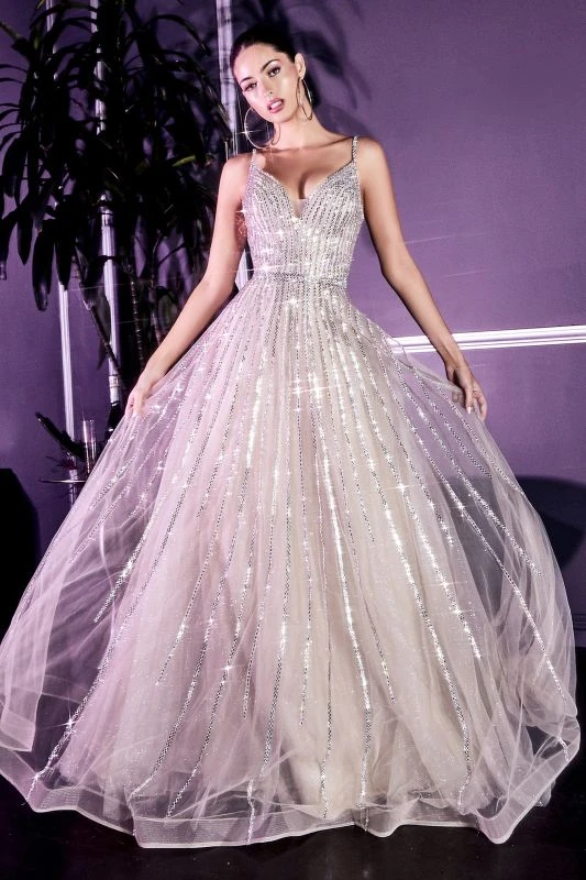 LaDivine by Cinderella Divine CD940 formal gown is styled in linear beaded tulle over glitter net, with a deep V-neckline, an open V-back, and spaghetti straps. The beaded waist adds definition to this sparkly prom ballgown, finished with a horsehair hem and court train.