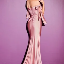 LaDivine by Cinderella Divine CD943 luxe jersey formal dress features an off-the-shoulder sweetheart neckline, a mid-rise back and self-tying bow sleeves. Gorgeous front and back ruching adds style to this slim prom gown, finished with a thigh-high slit, horsehair hem, and sweep train.
