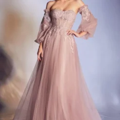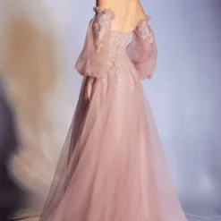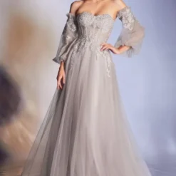 LaDivine by Cinderella Divine CD948 glitter tulle prom ballgown features a sheer corset bodice with a strapless sweetheart neckline and separate bishop sleeves. Tonal embroidery appliques add texture to this sparkly formal dress, finished with a low-rise back and horsehair hem.