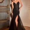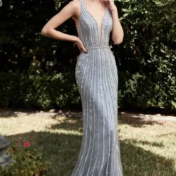 LaDivine by Cinderella Divine CD960 fitted prom dress is fashioned in linear beaded tulle on allover lace, with a deep plunging neckline and a low V-back. Sheer sides and a beaded waistband add style to this sleeveless formal gown, finished with a horsehair hem and court train.