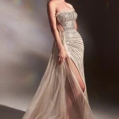 LaDivine by Cinderella Divine CD991 prom dress is crafted in linear beaded tulle, with ruffle edging from the strapless straight neckline to the low-rise back. The sheer illusion sides and high cutaway slit lend a sultry touch to this fitted designer gown, finished with a tulle sash, horsehair hem, and sweep train.