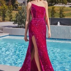 LaDivine by Cinderella Divine CH111 sequin velvet prom dress features a slim silhouette with a one-shoulder neckline, spaghetti strap and low-rise back. A cutaway slit accents this sparkly designer gown, finished with a sweep train.