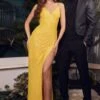 LaDivine by Cinderella Divine CH112 fitted satin formal dress features a sweetheart corset bodice with self-tying halter straps and a low-rise back. This trendy prom gown exits with a sweep train.