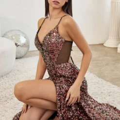 LaDivine by Cinderella Divine CH127 fitted sequin prom gown features a plunging neckline and spaghetti straps that tie on the low cutout back. Sheer sides add flair to this sparkly designer dress, finished with an off-center slit and a sweep train.