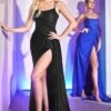 LaDivine by Cinderella Divine CL03 prom gown features a slim silhouette in sequin velvet, with an off-the-shoulder sweetheart neckline and a low zipped-up back. Side gathers add texture to this designer formal dress, finished with a high front slit and a court train.