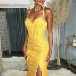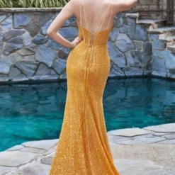 LaDivine by Cinderella Divine CM317 fit and flare prom dress features a sweetheart corset top with beaded double spaghetti straps and a strappy laced-up back. The slight basque waist and high front slit add style to this sequin formal gown, finished with a horsehair hem and court train.