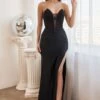 LaDivine by Cinderella Divine HT119 prom gown is crafted in luxe satin, featuring an off-the-shoulder sweetheart neckline, pleated midriff, and mid-rise back. Heat-set stones on the bust and side slit add glitz to this slim formal dress, finished with a side tail and a sweep train.