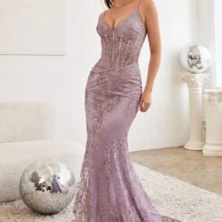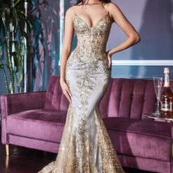 LaDivine by Cinderella Divine J810 prom dress is styled metallic embroidered lace, featuring a sheer corset bodice with a V-neckline and spaghetti straps. The sheer basque waist and the low V-back add flair to this trumpet silhouette formal gown, finished with a godet skirt, horsehair hem, and court train.