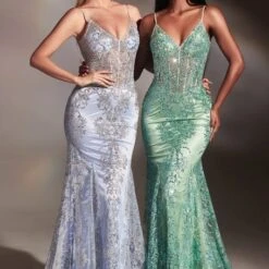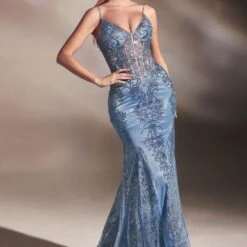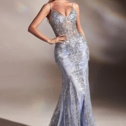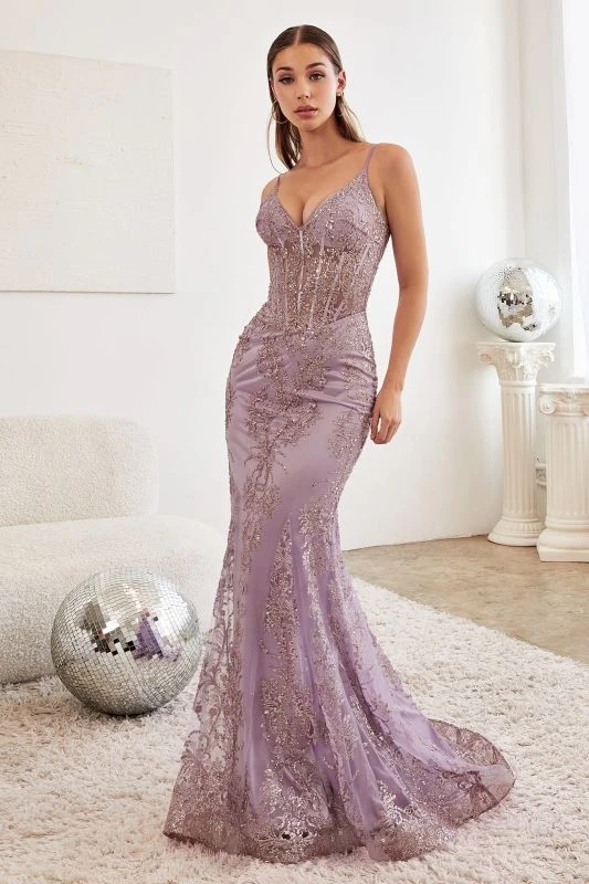 LaDivine by Cinderella Divine J810 Sheer Corset Spaghetti Straps Formal Gown
