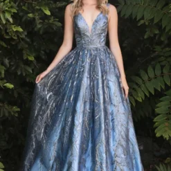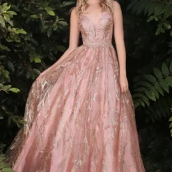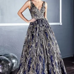 LaDivine by Cinderella Divine J812 formal dress is styled in beaded leaf embroidery over soft satin, with a plunging V-neckline, sheer sides, and a low V-back. This sleeveless A-line gown is completed with a fully gathered skirt and a sweep train.
