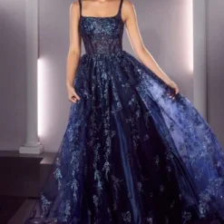 LaDivine by Cinderella Divine J840 prom ballgown is styled in floral glitter tulle, featuring a sheer corset bodice with a square neckline and square back. This sleeveless formal dress finishes in a fully gathered skirt, lined with luxe satin, and finished with a horsehair hem and sweep train.