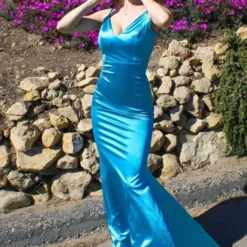 LaDivine by Cinderella Divine SE016 fitted prom dress is styled in neon stretch satin, with a V-neckline, adjustable spaghetti straps, and a low open back. The ruched derriere adds flair to this backless designer gown, finished with a sweep train.